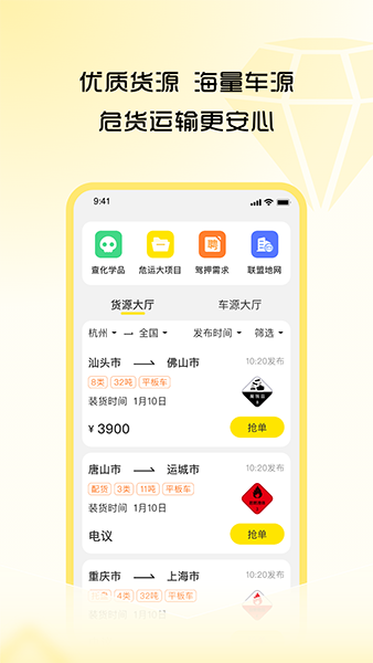 危司机APP是一款专为危险品运输行业打造的移动应用软件,由杭州为为科技有限公司开发。它通过互联网、AI算法和大数据技术,连接货主与合规危运车司机,提供快速接单、智能调度和安全监管等功能。平台拥有海量货源和司机资源,帮助货主轻松配货,司机往返有货,有效降低空返率。此外,APP还支持实时定位货物运输路线,掌握司机运输实况,并通过实名认证和多重资质校验确保交易安全。