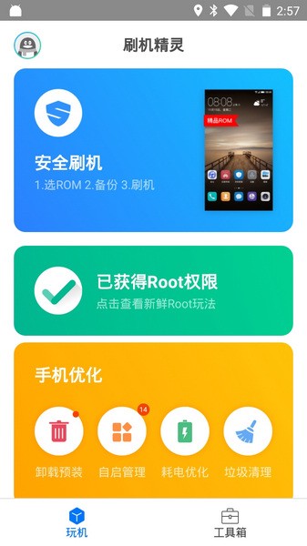 刷机精灵手机版是一款专用于安卓手机刷机的工具。这款软件内置多样的刷机辅助工具,可以帮助用户清理手机中不需要的文件并加快手机运行速度,维持稳定的运行状态,还可以重置整个手机的使用状态,重新安装系统。软件会自动获取手机的root权限,并且为用户直接提供手机刷机包,针对主流机型进行了优化。