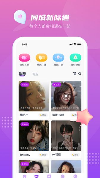 【结缘】:看同城附近,发现身边朋友,用心跳配配暧昧,陪你聊天视频,讲出你的真心话,随缘一键速配组cp,附近人约单玩吧,男友女友在线嗨聊。