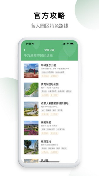 目前已经上线的公园包括: ·成都大熊猫繁育研究基地 ·锦城湖 ·桂溪生态公园 ·青龙湖 ·江家艺苑 ·萌宠乐园 ……