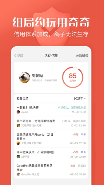 2、组局约玩用奇奇,信用体系加成,鸽子无法生存;