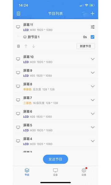 在节目列表界面点击“新建显示屏”,APP自动回读已连接的控制卡型号和分辨率,点击“确定“按钮进入显示屏节目编辑。
