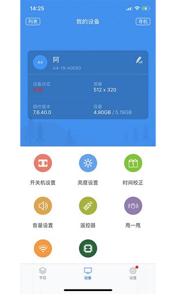 手机APP“屏掌控”除了更新节目外,还可以设置LED显示屏开关机、亮度、时间校正、遥控器和控制卡选型。