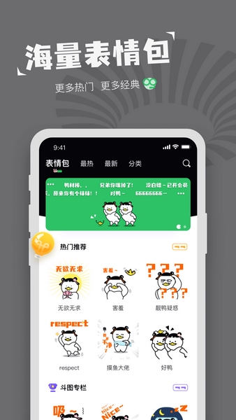 对鸭表情包制作是一个集合超多热门表情的斗图APP,拥有海量表情、个性原创设计和表情包制作等功能,