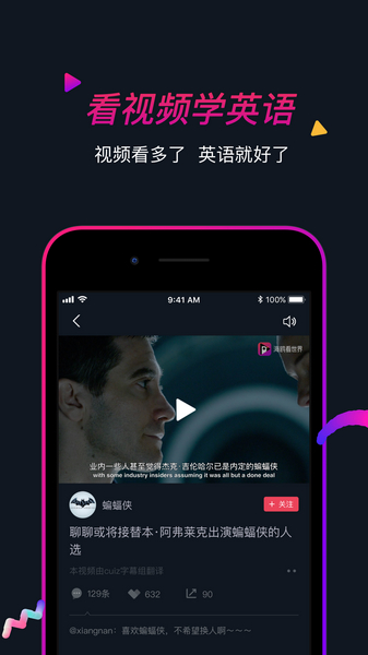 英语短视频全部配备中文字幕,让你不再担心英语视频看不懂,听不懂,轻松越过语言障碍,获取最有趣新鲜的海外英语短视频。