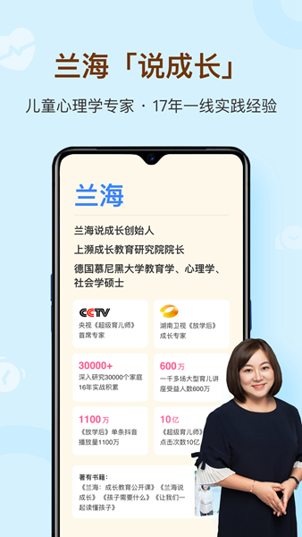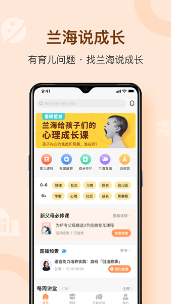 兰海说成长APP是一款针对儿童心理健康进行开发的手机软件。孩子的心理引导是教育中非常重要的一个部分,正确的心理指导不仅能让孩子和家长交流更加和谐,同时也能让孩子学会正确的三观。软件中有非常多专业导师,每天都会有很多直播可以观看,ci外也有海量的教育课程可以观看,此外如果有不懂的地方也可以随时向导师们在线请教,可以获得专业的一对一解答服务。