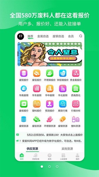 爱废料网APP是一款专注于废料资源回收与二次利用的软件,特别适合金属回收行业的人使用。它提供最新的废料报价、海量货源和实时交易功能,帮助用户快速买卖废料。app还支持店铺查询、实时筛选热门资源等实用功能,极大提升了交易效率。