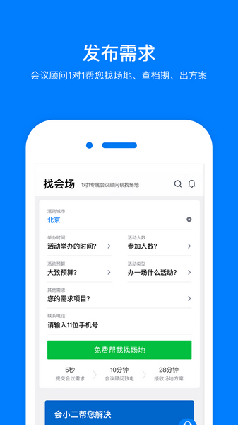 1.【高效便捷,省时省力】5秒提交需求,10分钟顾问致电,30分钟接收会场方案。