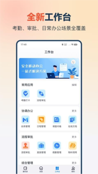 5、全新工作台: 提供多种办公场景的工作台,满足不同用户的需求。