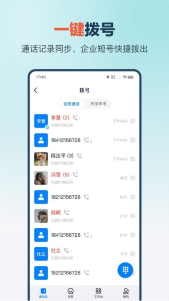 2、一键拨号: 支持用户在线一键拨号,方便快捷地拨打企业短号。