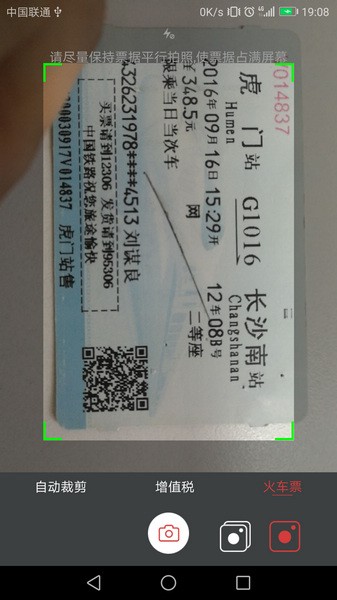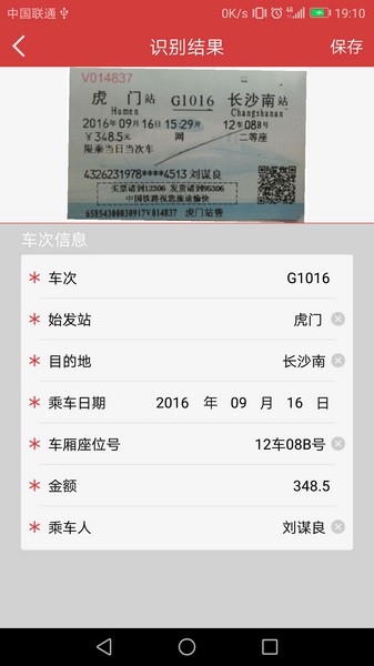 7. 自动识别火车票信息,并保存。