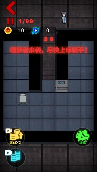 来躺平呀是一款精彩刺激的策略塔防游戏,玩家需要在倒计时结束之前找到适合自己的位置并躺下发育,产出金币,并用金币制造武器或升级门来抵御噬梦者的进攻。游戏中拥有很多玩法,玩家可以自由选择成为噬梦者还是抵御噬梦者的人,而且甚至可以单挑噬梦者,满足一些喜欢有挑战的玩家进行游玩。除此之外,游戏内还拥有联机模式,可以邀请自己的好友一起来抵御敌人。