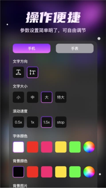 炫彩弹幕软件是一款特别方便的工具,专门用来在各种场合展示个性化的弹幕应援。无论是生日派对、演唱会还是聚会,它都能让你轻松设置独特的文字内容,还能调整颜色、方向和大小,甚至可以添加喜欢的背景图片,让整个弹幕看起来更生动有趣。特别是它的多设备切换功能,可以在手机和手表之间无缝切换,随时随地展示你的应援风格。操作起来也很简单,界面直观,即使是第一次使用的人也能快速上手。