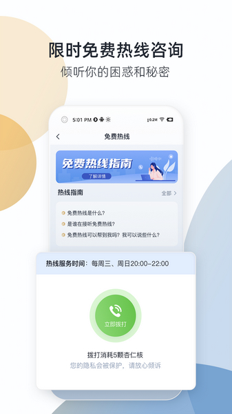 【免费热线】免费热线是杏仁盒平台为用户提供的一种语音的、免费的、即时的心理咨询福利。本质仍是心理咨询,用户可以在每周三、周日的晚上拨打免费热线获得心理支持和帮助。通过一对一私密型免费通话,在线吐槽烦恼,也许收获不一样的建议。