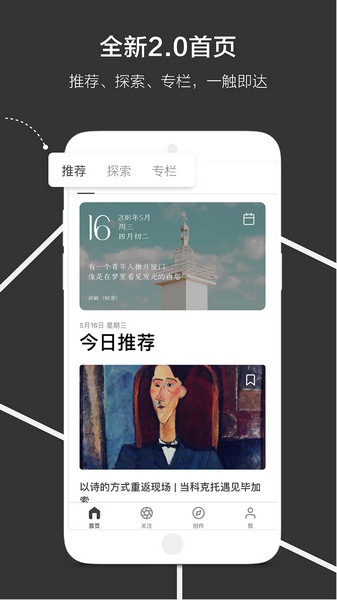 不仅仅是诗歌,App 内的评论、小说、对话、音乐、影像等等,都经过悉心选荐。「宠物故事」「疾病的隐喻」「文艺片观影指南」……各专题正在更新中。每日诗句「日签」,可阅读也可自己创作。