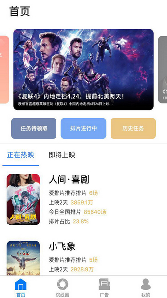 爱排片APP是一款集院线排片资源、影城广告资源、社区论坛等功能于一体的电影行业专用软件。平台致力于为电影制片方/宣发、院线经理、电影从业人员三大群体提供优质的排片辅助服务,让电影上映和排片更加轻松。在软件中,先由片方发布影片排片任务,包括排片周期,院线等级要求,排片量,积分奖励等,之后院线方根据自身条件选择性接受任务,并每天上传排片凭证,在片方审核通过之后,可获得相应积分奖励。软件大大方便了影院等相关人群的排片工作,大大提高了办公效率。