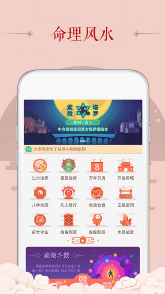 3、丰富内容:除了命理风水的庞大数据库外,还提供丰富的传统民俗咨询,图文并茂的展示给用户。