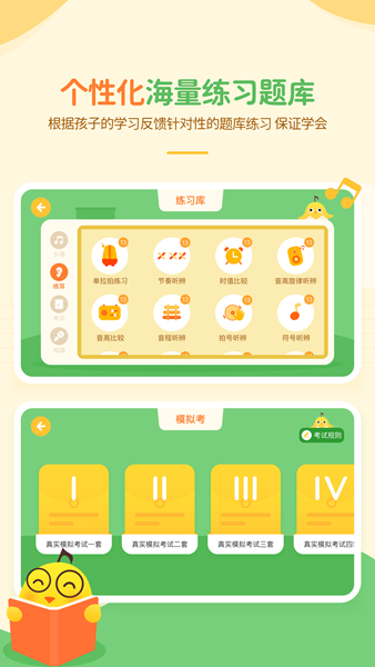 9、 丰富全面的学习练习内容,包含了音符、音阶、键盘、音程、和弦、节奏、旋律、调式等多种内容。