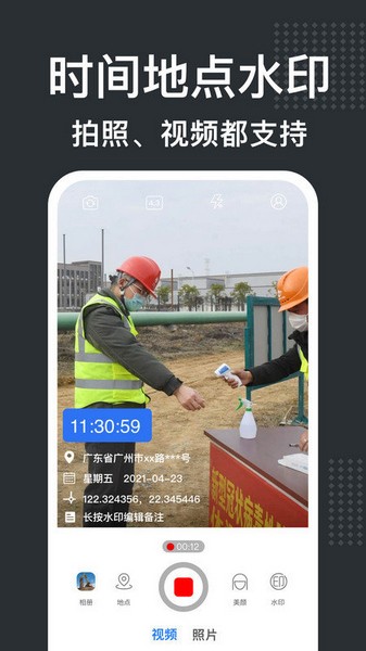 工程水印:工程施工管理专用,准确记录工程影像资料,加工程名称、海拔、天气、备注等水印信息;