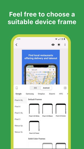 选择真实的设备,纯色或粘土框架。调整大小,旋转并将设备放置在屏幕快照中的任何位置。您甚至可以添加两个设备。
