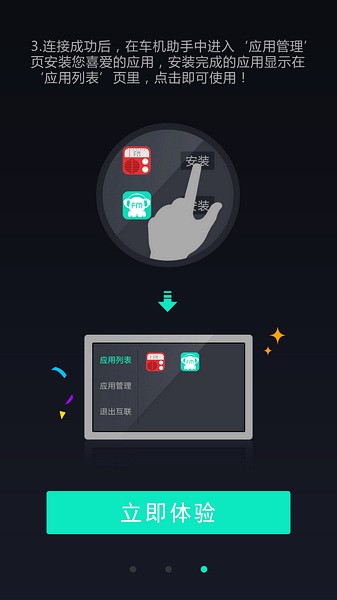 3、连接成功后,在车机助手中进入“应用管理”页安装您喜爱的应用,安装完成的应用显示在“应用列表”页里,点击即可使用。