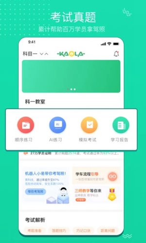 考啦考啦APP是一款主打驾照考试学习的软件,界面简洁清爽,功能丰富强大,采用前沿AI技术,将软硬件相结合,带来全新驾考学习平台!汇集了海量科一、科四历年真题,支持顺序练习、模拟考试及AI练习,多多练习以便查漏补缺!在结束学习后,还能通过学习报告发现不足之处!在上车实操时,还有AI教导课程,并实时监管车辆周边情况,轻松识别周围障碍物及其他危险情况,保护学员的安全!同时一人一车的教学环境,让你更加轻松!