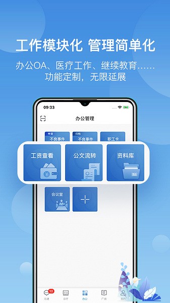 软件有好多特色:界面优化得很流畅,功能齐全,还有专门的工作模块化管理,方便医生处理各种事务,比如办公OA、医疗工作、继续教育等。优势也很明显,可以一键提交请假申请随时查看批复,还能线上预定会议室,自动提醒待办事项,创建工作日,绑定职工卡使用起来更方便。