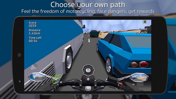 骑摩托车在一个或两个单行道,转弯和现实之间移动的交通,通过城市,乡村道路和沙漠环境中进行筛选。所有的光荣低多边形缺乏细节