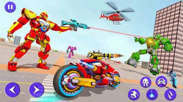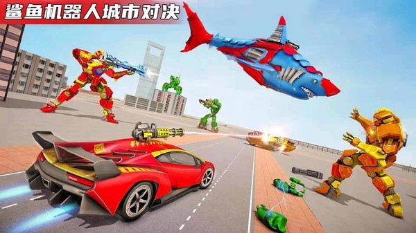 变型机甲战士是一款超好玩的3D动作射击游戏!你可以控制各种酷炫的机甲变形器,变成摩托车、直升机甚至机械鲨鱼,在城市或海洋中战斗。每种形态都有独特的技能和武器,玩法特别刺激。比如开着摩托车飞驰追击敌人,或者变成鲨鱼在水下畅游攻击,真的超级有趣!