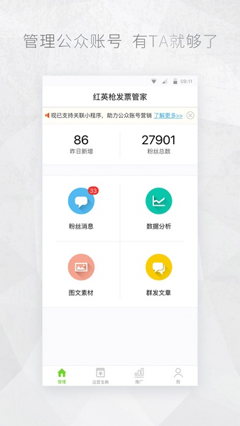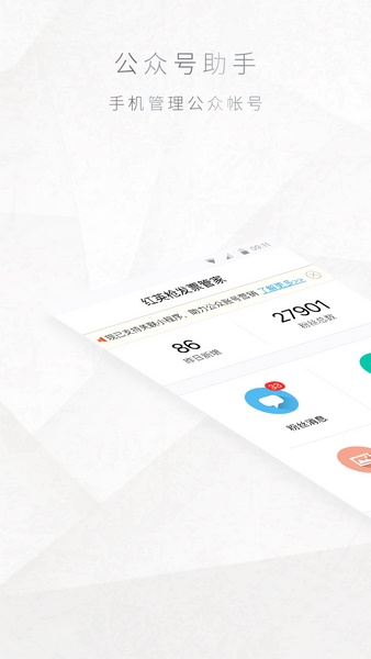 公众号助手,是公众平台手机版,直接手机管理公众帐号(订阅号和服务号),随时随地管理粉丝消息、群发图文信息,实现公众号运营者与粉丝之间的实时互动,帮助线上微商公众号推广和自媒体互粉,更好更快营销。还可以绑定小程序运营,达到互动交易两不误。