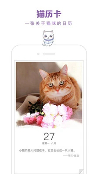 2、每一天都会分享一张猫历,一条猫片,一个猫物,一枚猫图...每天十分钟,尽享有猫的美好生活。