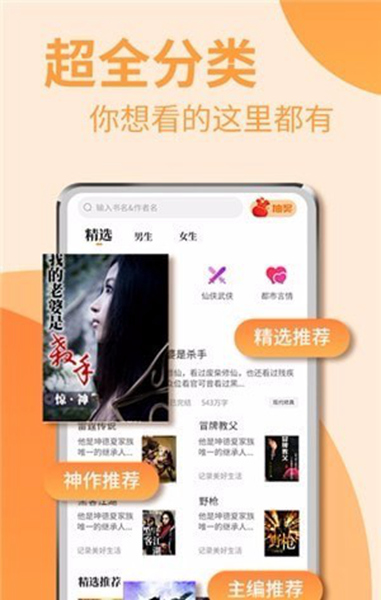 1、提供男频女频两大板块,为双方精选挑选不同优质分类小说;