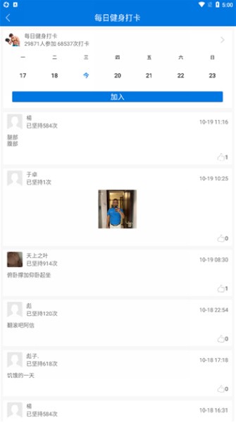 6、另外在打卡板块中,点击进入即可进入每日健身打卡,下面还有着其他用户的打卡记录;