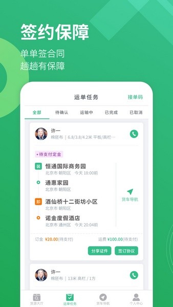 【签约保障】 单单签合同,趟趟有保障!平台货源免费提供签约服务,签合同,更放心,货款不拖欠。