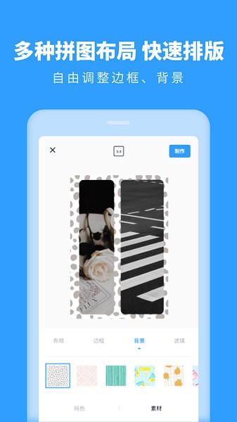 4、轻松剪裁、方便实用,全面支持多张照片任意进行拼接而成。