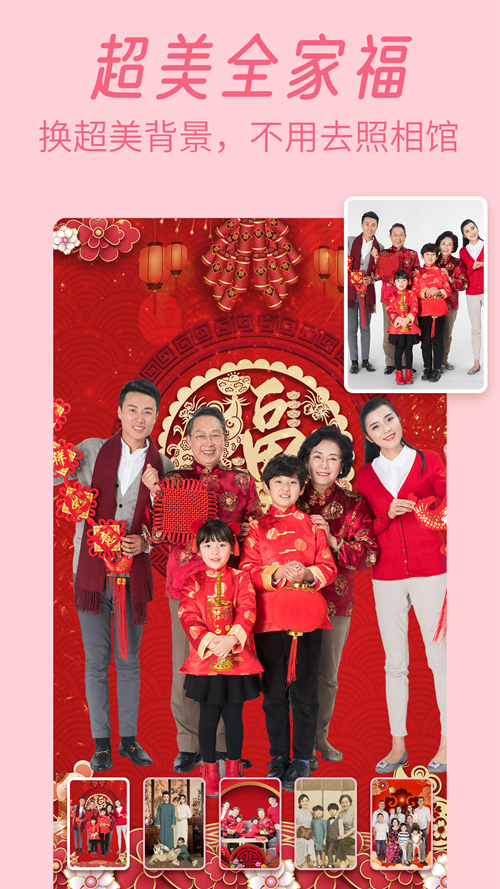 4、超美全家福:相册大师可以自动抠出全家福合照,提供精美的全家福背景,从此拍全家福不用再去照相馆啦;