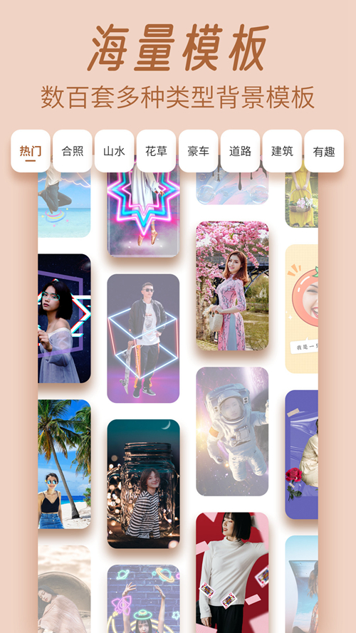 相册大师P图版是一款简单易用的图片视频制作编辑工具。通过人工智能识别图片中的人像并实现自动抠图,提供数百个免费背景模板,满足您多种场景需求,温馨全家福背景、全球旅行、超美风景,应有尽有。