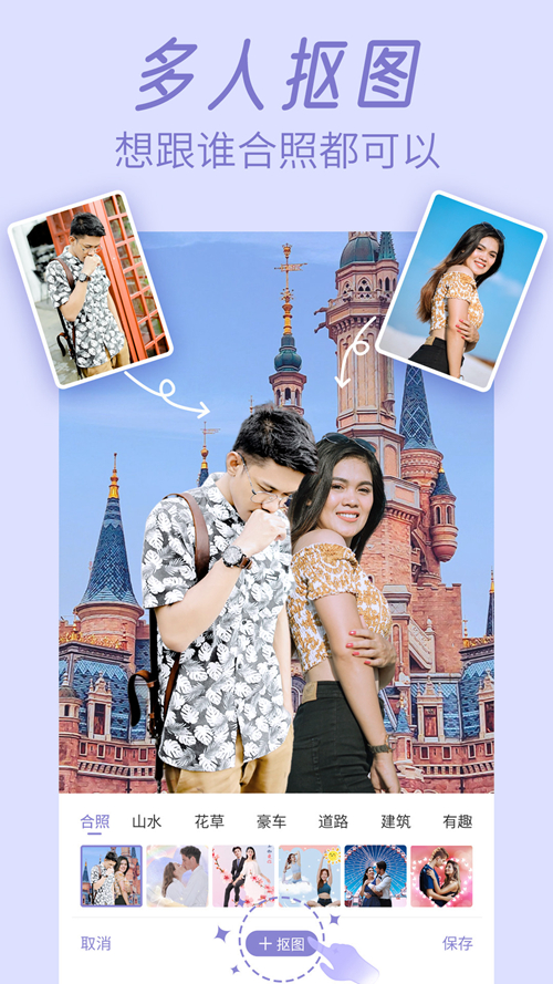1、多人抠图-合照神器:您可以添加多张人像图,还可以直接复制,随意调整人像位置大小,发挥自己的想象力,名人合影、隔空合照变得轻而易举;