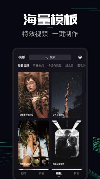 特效视频,轻松制作热门视频,一张照片玩转换装/卡点,免去拍摄写真专辑的麻烦,一键智能成片。