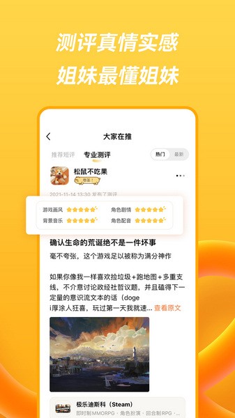 在这里,能看到同好姐妹们对游戏的「推荐值」和「推荐短评」,以及针对画面、剧情、CV、玩法等多重维度出发的细致「测评」。所有游戏的长板和短板都一目了然,每一份测评,都来自姐妹们真情实感的体验。