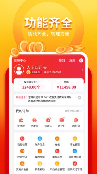 4、设置丰富的个人管理工具中心,个人主页提供权益凭证、审核商品、地址管理以及销售补助等工具;