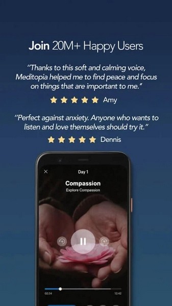 对于长期失眠或压力较大的人来说,这款应用确实是个不错的选择,它不仅提供了丰富的资源,还能让用户在冥想中找到内心的平静和幸福感。如果你正在寻找一款高效又便捷的睡眠辅助工具,Meditopia破解版值得一试!