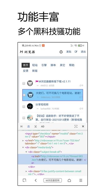 M浏览器官方手机版是一款集成了大量功能的安卓浏览器app,自带了视频悬浮窗播放、拦截广告以及视频嗅探等功能,可以让用户在手机网页上看视频也变得非常方便,并且能够将这些视频下载到本地进行观看。同时它还支持查看网页的源代码,还有隐私、夜间、阅读、无图、电脑等多种模式可以切换使用。更厉害的是该浏览器还支持添加油猴脚本和扩展,并且提供了获取的渠道,用户可以很方便地添加自己需要的额外功能。