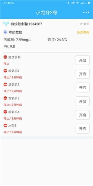 4.点击有设备的池塘进入到池塘设备详情界面,可以看到设备的状态,可以查看该设备检测的水质历史数据,可以控制设备以及查看池塘的创建信息;