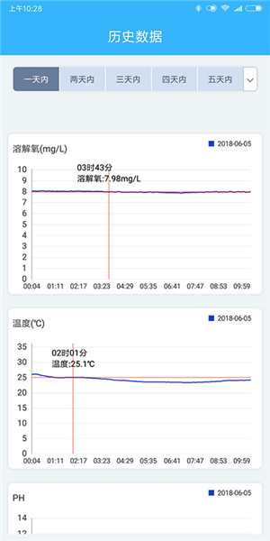 2、app中记录了池塘的所有数据,还可以查看池塘的历史数据,能随时了解池塘情况;