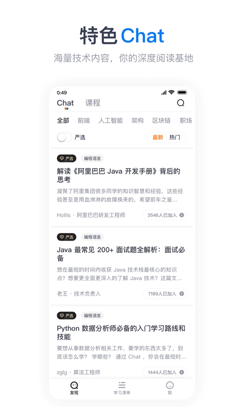 GitChat是为广大开发者设计的知识服务软件,这里每天都有经过严选的优质文章推送,帮你掌握最新的知识技能,同时还有大量以往发布的知识内容等你发掘。这里有很多为初学者准备的入门课程,从理论到实践都非常详细,还有更多进阶课程,帮你提升技能创造更多空间。此外还有专业老师在线指导答疑,更加针对性地解决学用户的问题,用户还可以根据个人情况自定义学习计划。精选业内相关文章,让你对技术世界有更深刻认识
