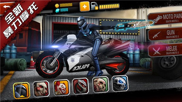 《暴力摩托3无限金币版》是一款超好玩的摩托车战斗游戏,画面特别精致,玩法也很刺激。作为系列第三部作品,游戏里所有赛车都解锁了,还能用无限金币和钻石升级装备,感觉爽到不行。比赛中你可以用拳头、脚踢等动作打敌人,警察也会来干扰,得时刻小心。