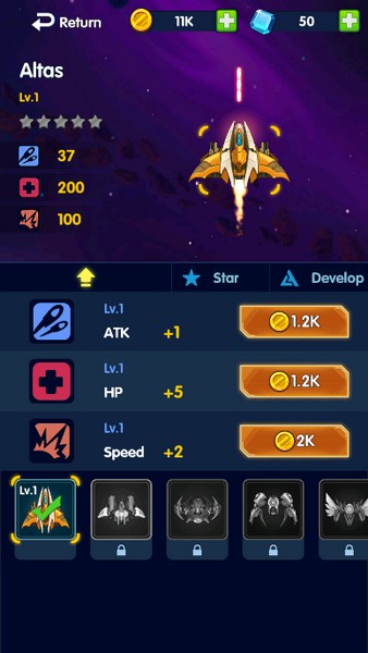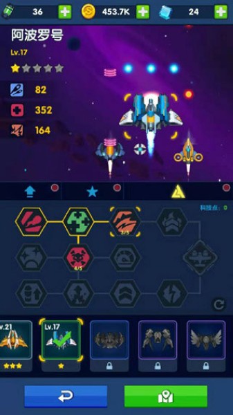 5、在太空背景下,驾驶不同战机,不同角色,搭配不同装备对抗敌机