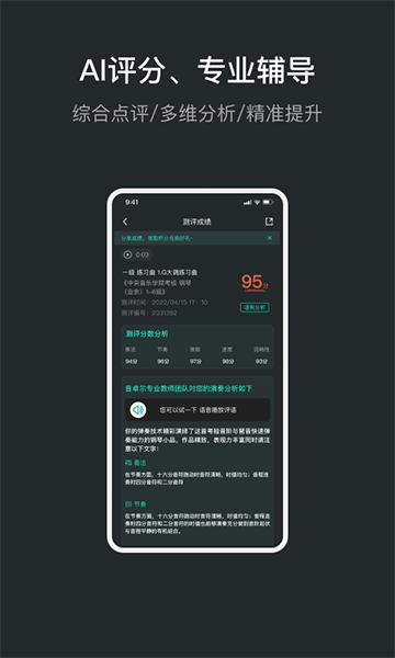 音卓尔可以对用户参与模拟考级的考试内容进行智能评分,让用户可了解自己的考试成绩。