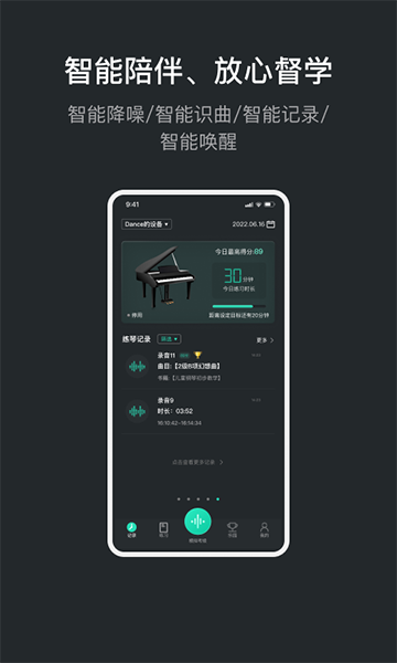 将用户所弹奏的乐曲通过录音来进行练琴记录,让用户可随时查看历史练琴记录内容。